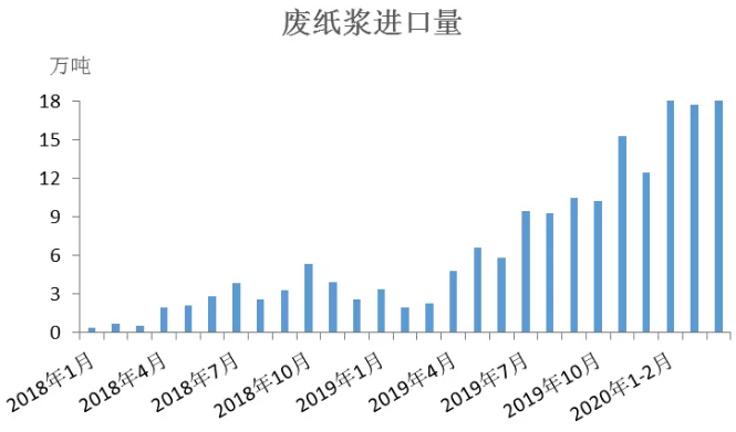 我國大規(guī)模進口廢紙漿始于2018年,當年全國共進口廢紙漿在30萬噸,到2019年,進口量增加到92萬噸。